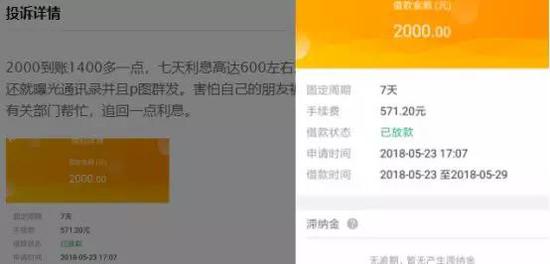 2018年5月29日,叶先生则投诉称,其通过拿去花借款2000元,实际到账1428.8元,七天利息(手续费)高达571.2元。据此计算,拿去花合作现金贷平台的综合年化费率高达1489%。