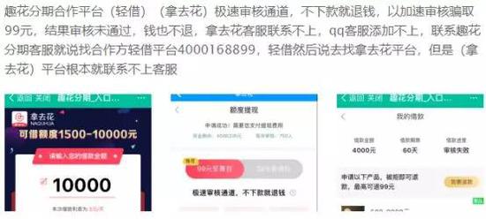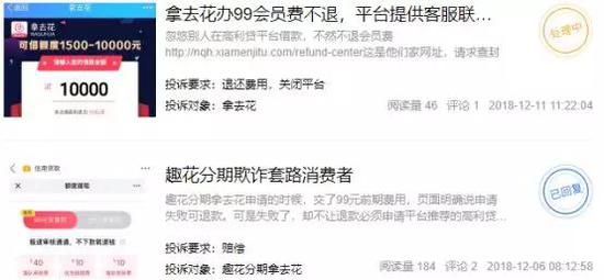 2018年12月3日,冯先生投诉称,其从拿去花申请趣花分期合作平台(轻借)申请借款,但审核不通过平台不退99元加速审核费。他在帖中,自己在联系趣花分期后,平台让其联系合作方轻借平台,而他联系轻借平台又被告知联系拿去花。然而,自己却根本联系不上拿去花的客服。