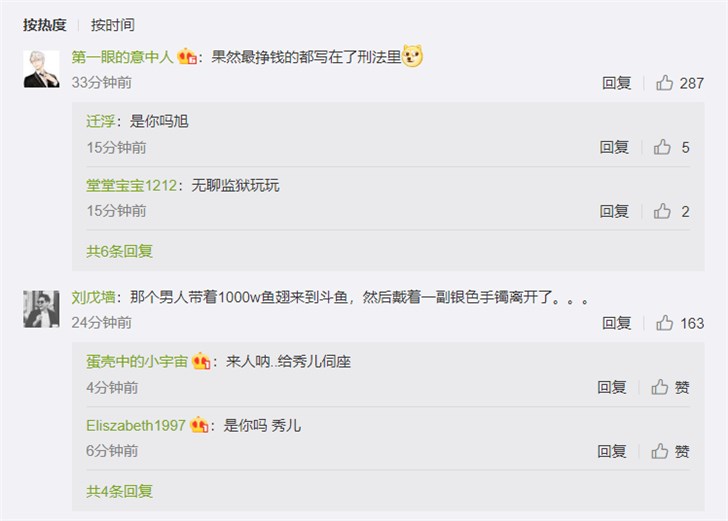 而在“HAC无聊”被斗鱼官方发现是利用系统漏洞刷钱之后,网友也纷纷表达了自己的看法。有网友调侃“果然最挣钱的都写在了刑法里”、“那个男人带着1000w鱼翅来到斗鱼,然后戴着一副银色手镯离开了。”